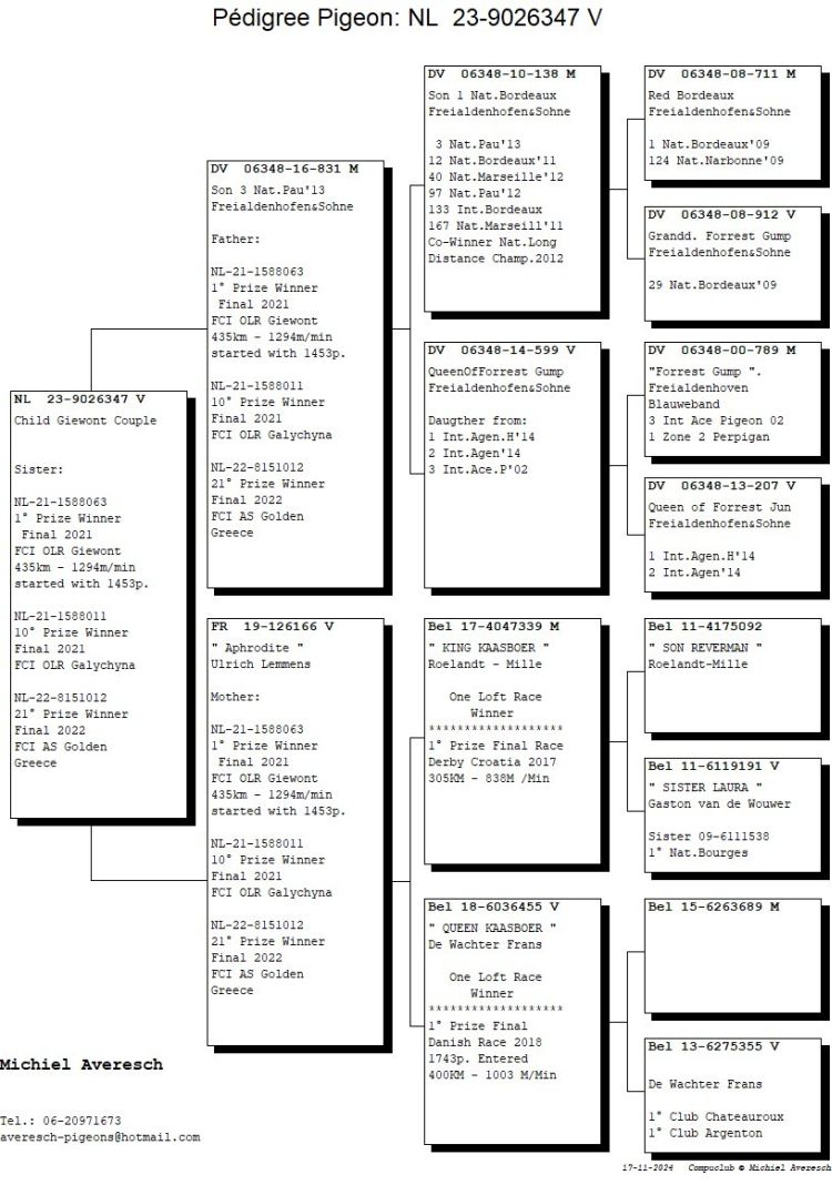 The pedigree combines Freialdenhofen & Söhne long-distance national power (Bordeaux / Marseille / Narbonne) with proven OLR final winners including “King Kaasboer” (1st Prize Final Derby Croatia 2017) and “Queen Kaasboer” (1st Prize Final Danish Race 2018).