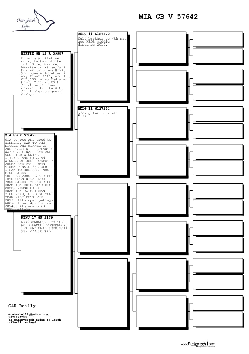 Mia is a proven ‘factory’ hen—dam/granddam to winners, including high prize money OLR performers. This is exactly the type of hen to build a loft around.