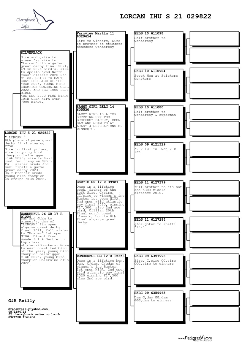 All enquiries regarding the sale should be directed to Steve O’Dea at Pigeon Partners using the email address ([email protected]), WhatsApp or SMS (+353 83 1289981). No callers or Loft Visitors to the Reilly Loft Loft without prior approval and arrangements being made via Pigeon Partners. Graham will welcome potential bidders who want to see specific birds prior to the sale. All bids are binding, and must be paid for via the Pigeon Partners site prior to collection arrangements being made.