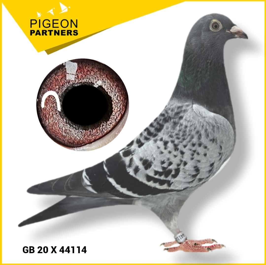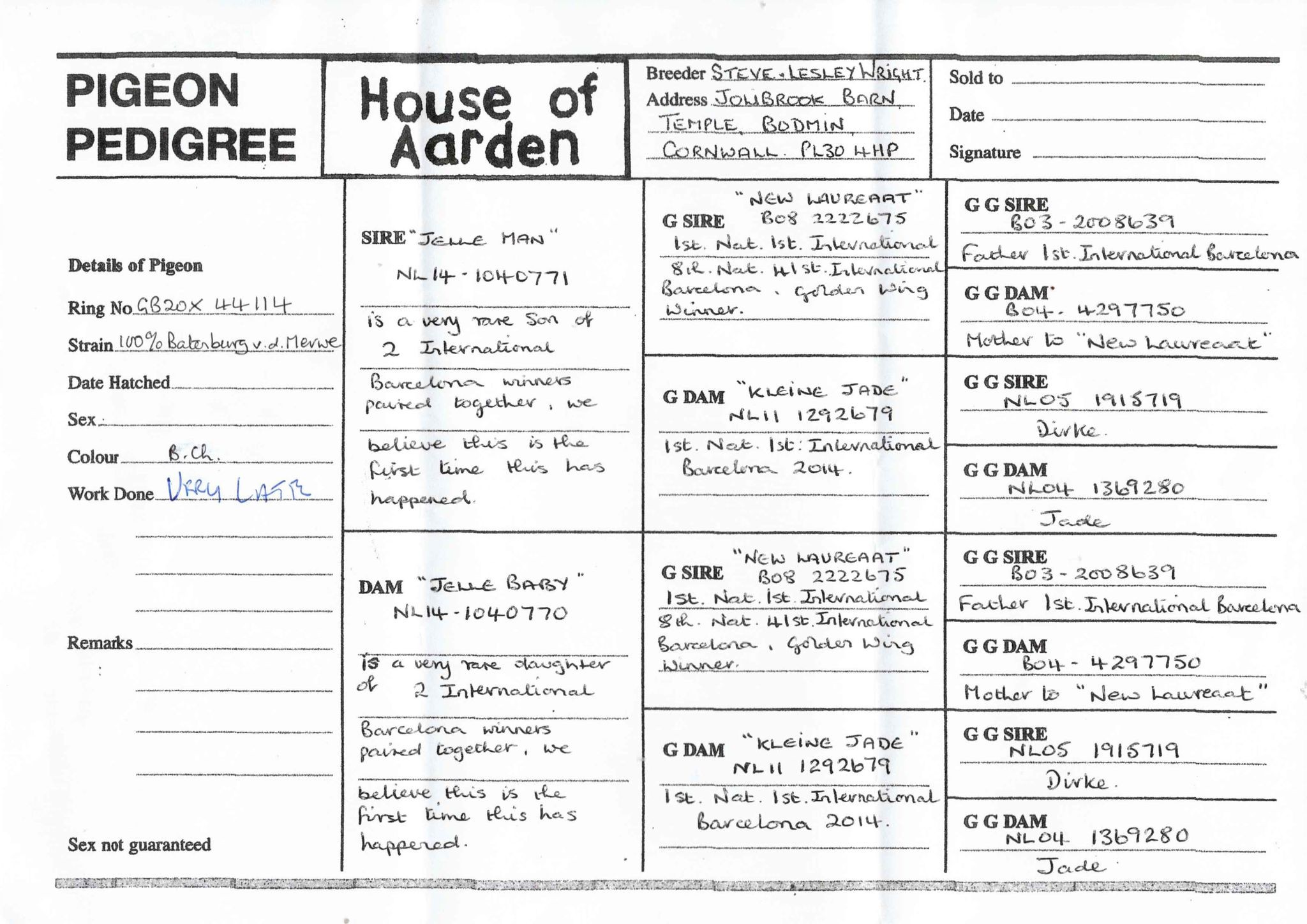 Pigeon GB20X 44114 is a 100 percent Baltenburg v.d. Merwe Blue Chequer, very late bred, with an exceptionally strong pedigree for International Barcelona racing. Both sire Jelle Man and dam Jelle Baby are direct children of New Laureaat and Kleine Jade, making this pigeon double inbred to two International Barcelona winners.