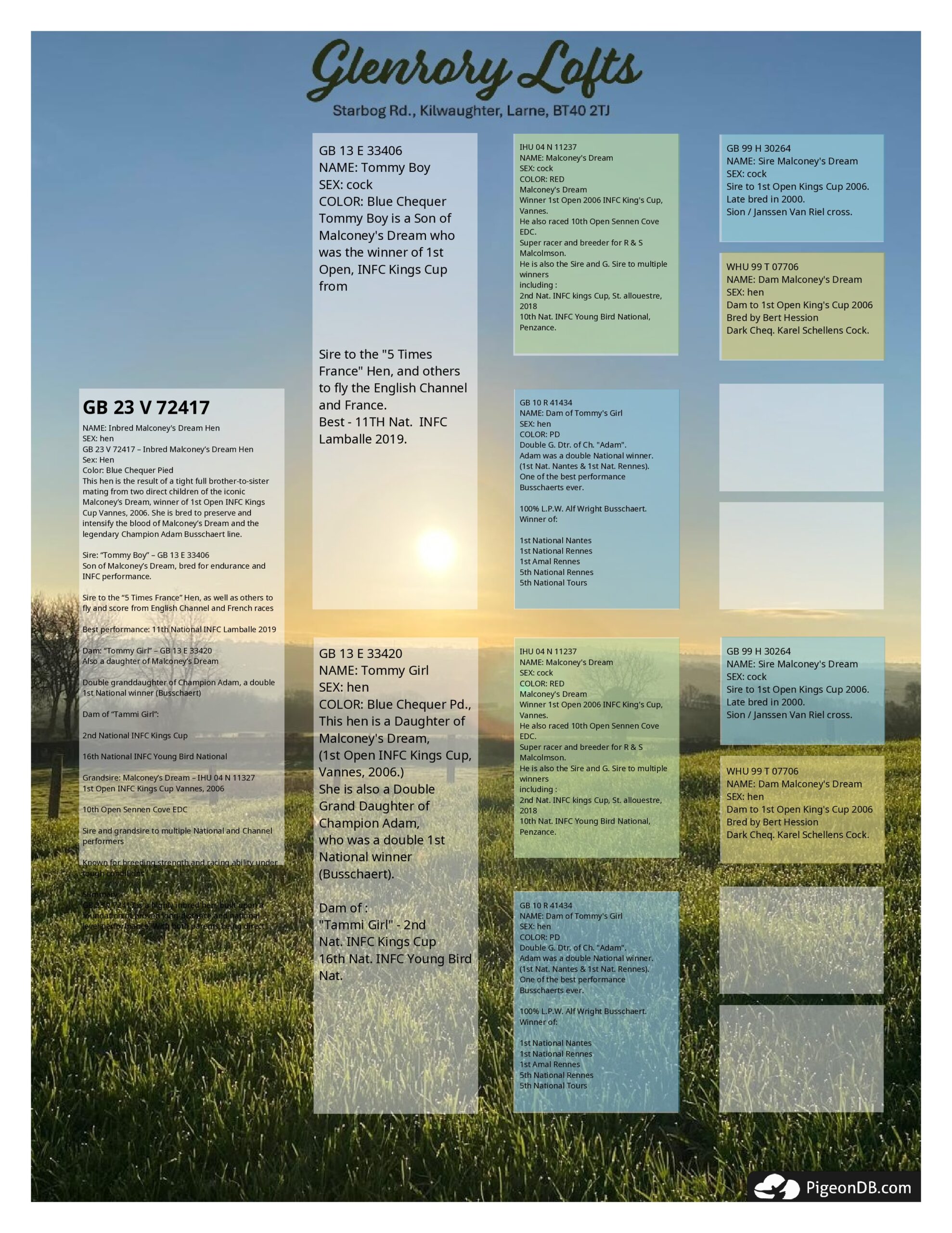 GB 23 V 72417 is a highly inbred hen, built upon a foundation of proven long-distance and national-level performance. With both parents being direct children of Malconeys Dream, and further reinforcement from Champion Adam, this hen offers exceptional breeding value. Her genetic background includes: