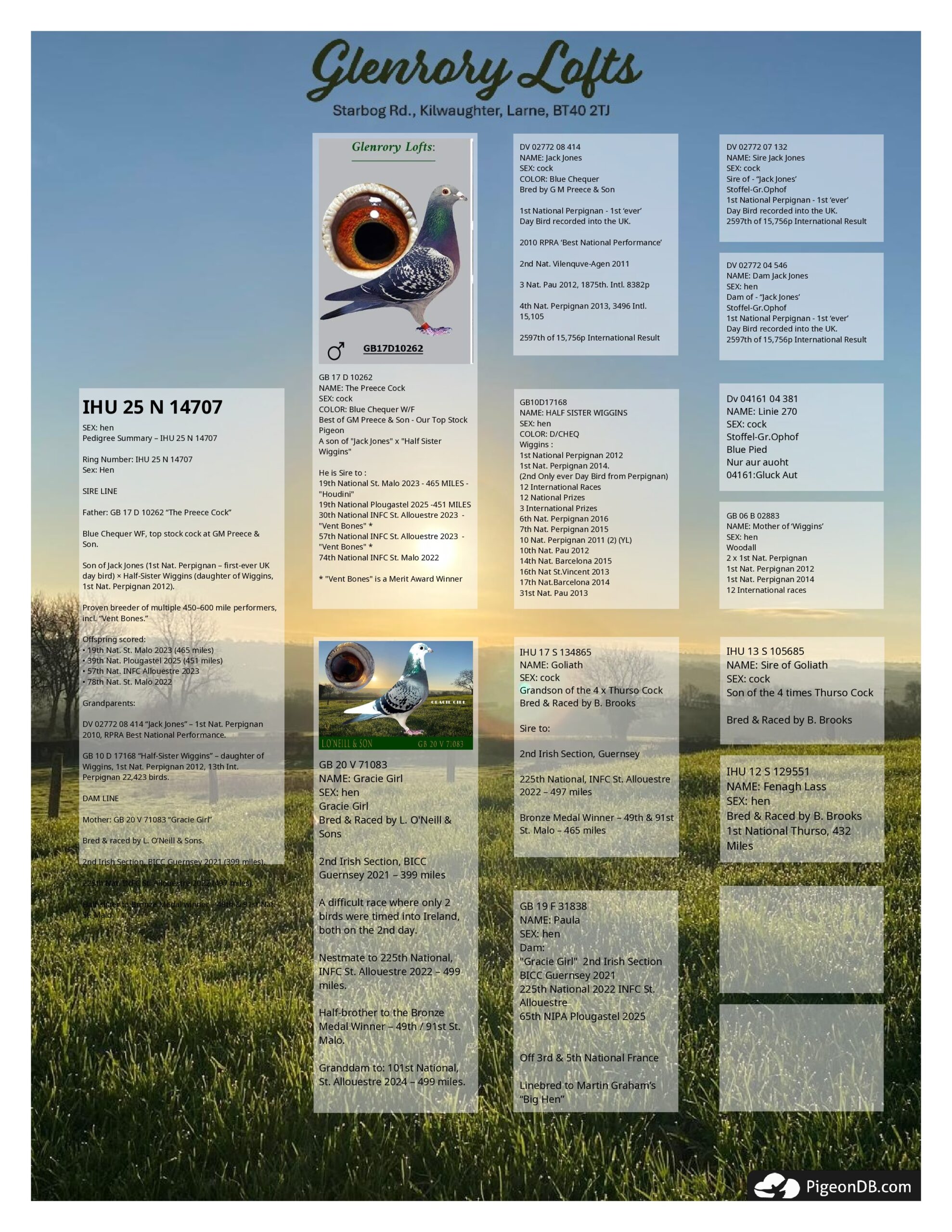 This hen carries a balance of Preece International distance blood and Brooks/Graham Irish National winners, making her an excellent prospect for stock or distance racing.Pedigree Summary IHU 25 N 14707