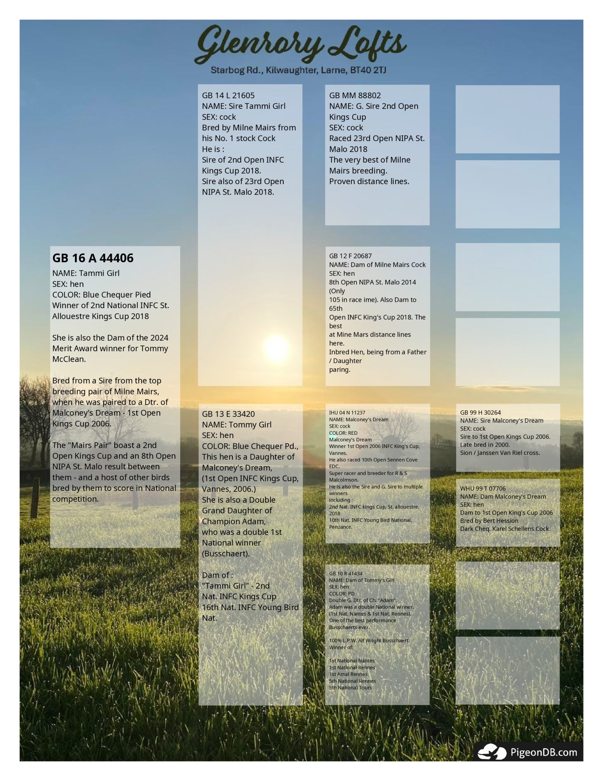 ?The Preece Cock? Bred by GM Preece, Grand Sire of the loft, Sire & G. Sire to top French performing birds with numerous different hens. He features with many of his sons & daughters in the sale. Highlight performances include ?Houdini? 19th Open NIPA St. Malo (Also in the sale), ?Vent Bones? ? Kings Cup Merit Award Winner, ?04? ? the only bird in the Carrick Centre in the 2025 NIPA St. Malo race.