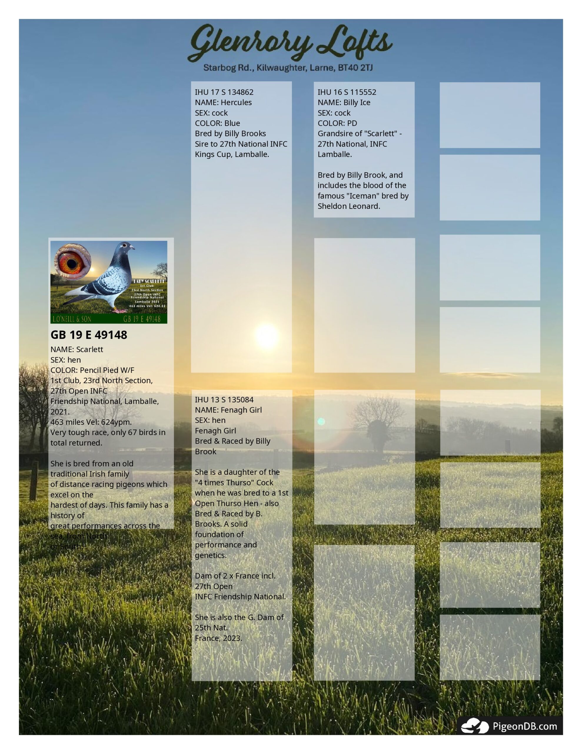 ?Goliath?- Sire to many top national performers and also merit award pigeons. His daughter (?Gracie Girl? ? also in the sale) was 2nd Irish section BICC Guernsey. Breeding birds which excel on hard days ? from the Billy Brooks colony.