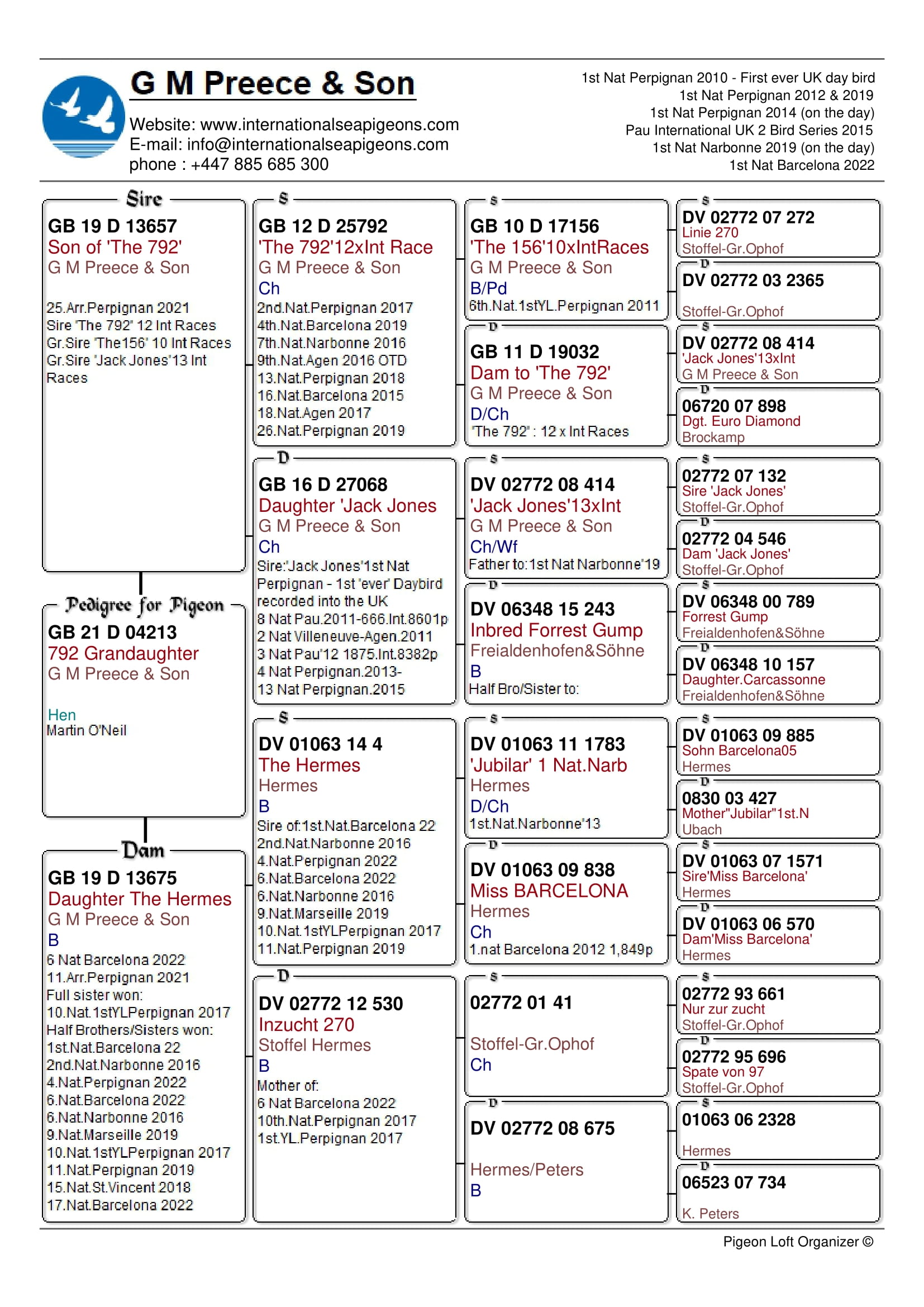 This is a pedigree for a hen bred by G M Preece & Son, specifically a Grand Daughter of The 792, one of their most celebrated performance breeders. She is also a Grand Daughter of “The Hermes”, who bred 1st National Barcelona into the UK in 2022, and is himself bred from a Barcelona winner.