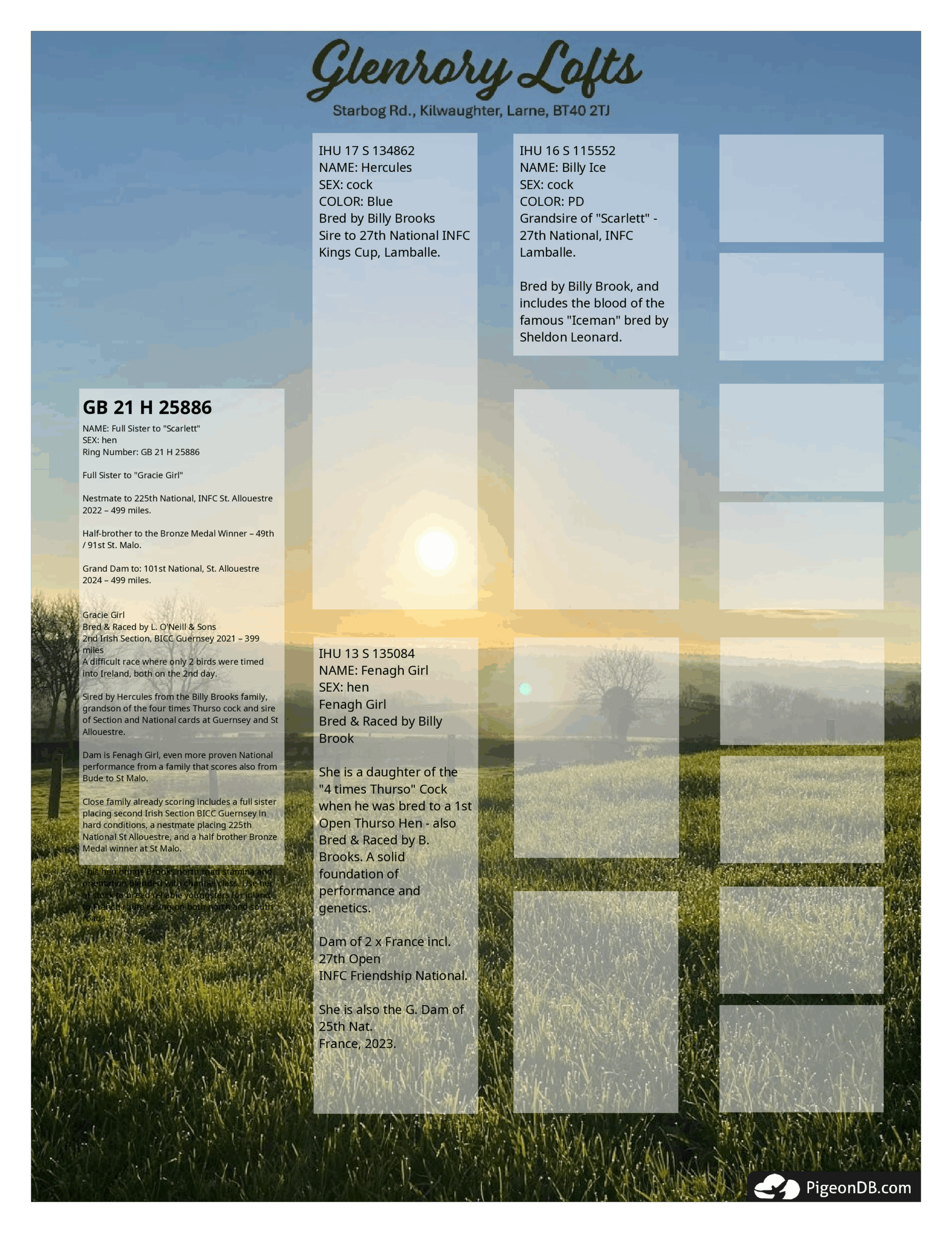 ?Goliath?- Sire to many top national performers and also merit award pigeons. His daughter (?Gracie Girl? ? also in the sale) was 2nd Irish section BICC Guernsey. Breeding birds which excel on hard days ? from the Billy Brooks colony.