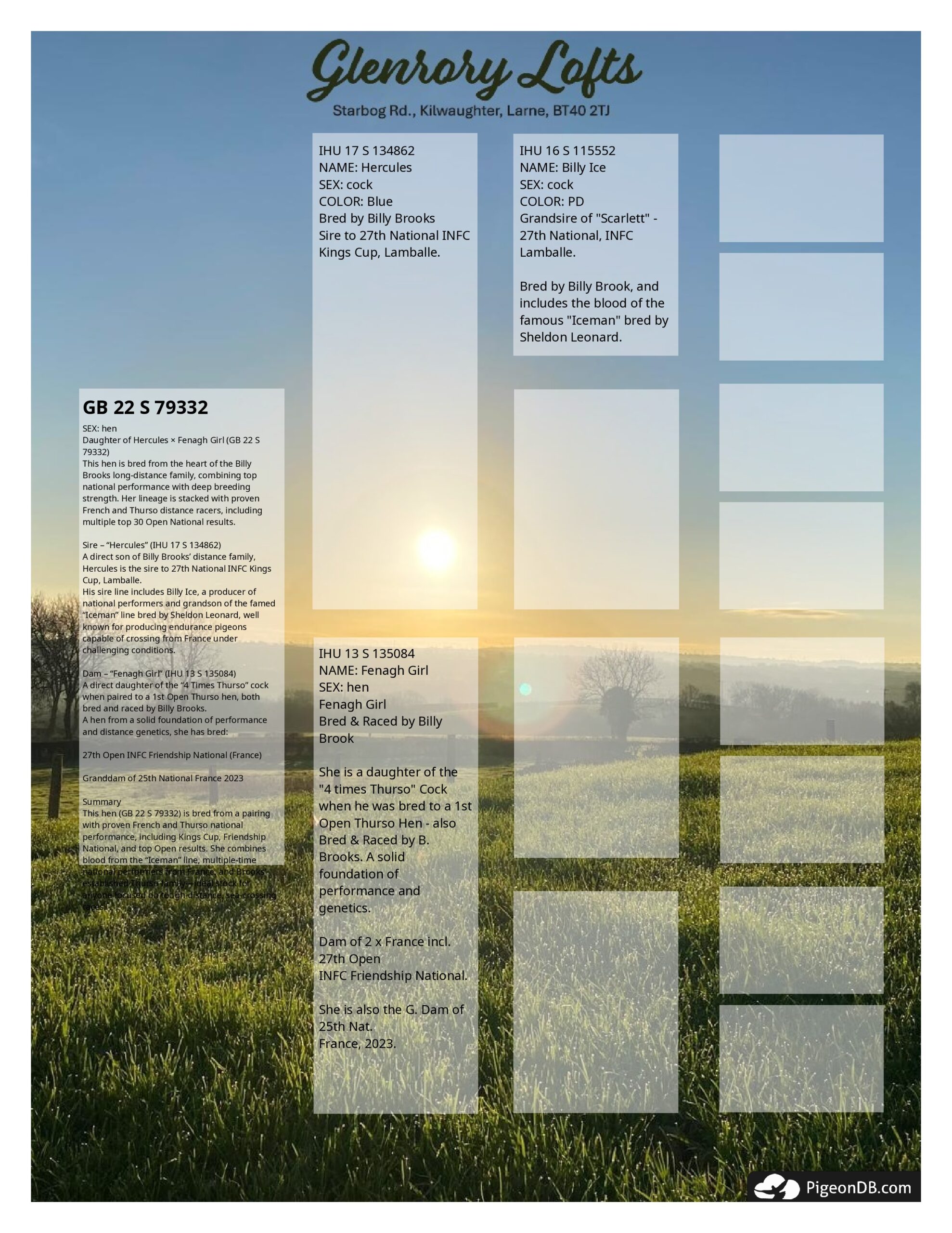 This hen (GB 22 S 79332) is bred from a pairing with proven French and Thurso national performance, including Kings Cup, Friendship National, and top Open results. She combines blood from the Iceman line, multiple-time national performers from France, and Brooks established Thurso familyideal stock for anyone focused on tough-distance, sea-crossing races.