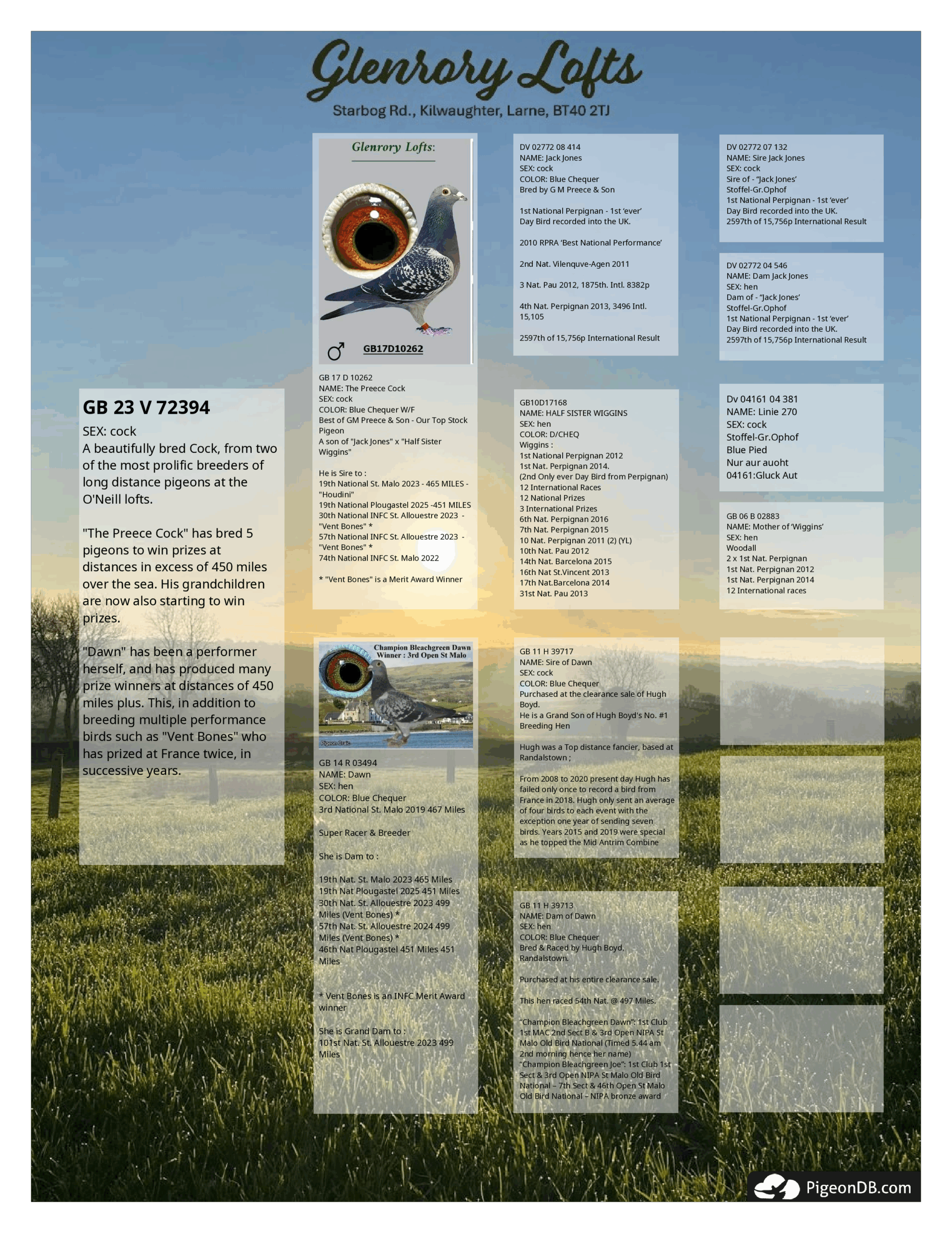 ?The Preece Cock? Bred by GM Preece, Grand Sire of the loft, Sire & G. Sire to top French performing birds with numerous different hens. He features with many of his sons & daughters in the sale. Highlight performances include ?Houdini? 19th Open NIPA St. Malo (Also in the sale), ?Vent Bones? ? Kings Cup Merit Award Winner, ?04? ? the only bird in the Carrick Centre in the 2025 NIPA St. Malo race.