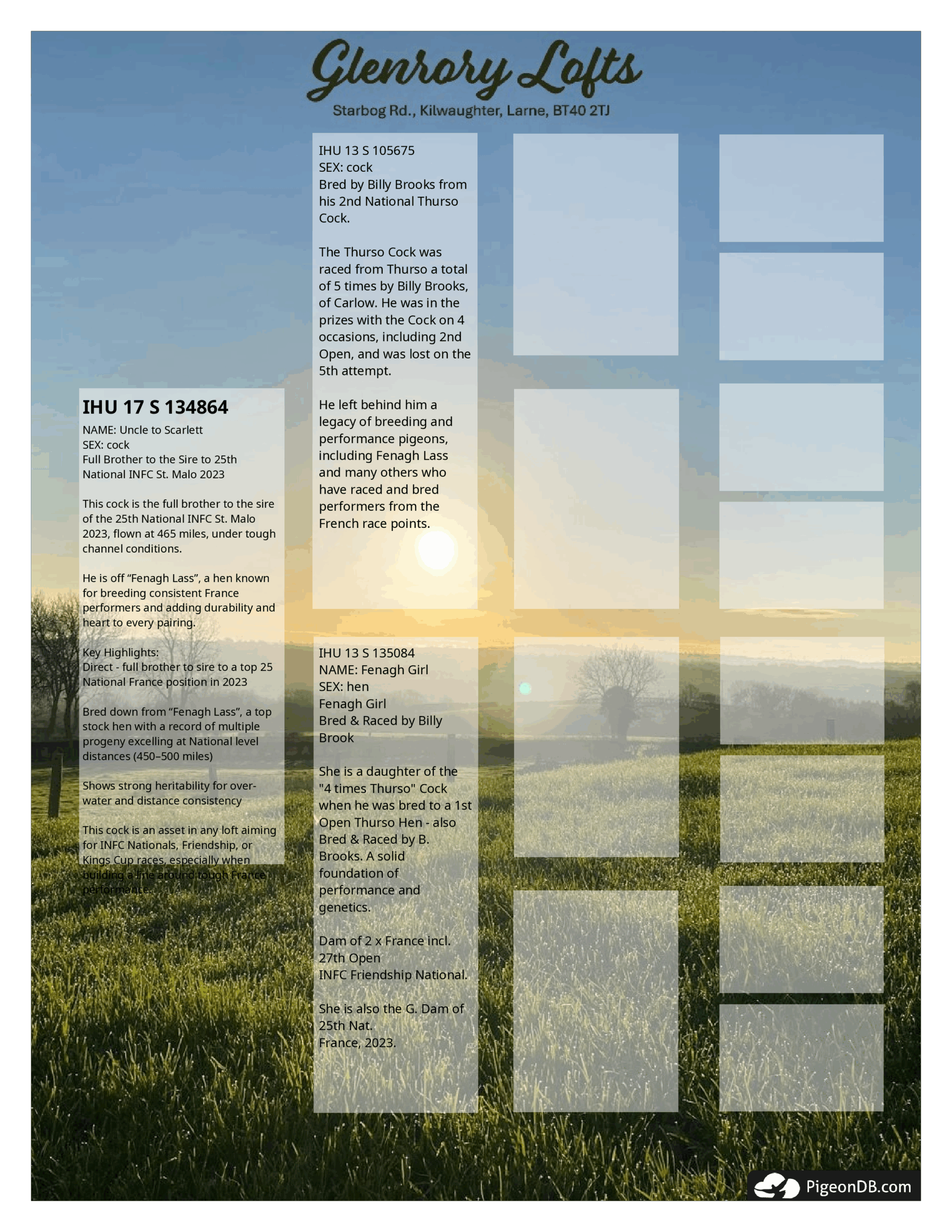 Bred down from Fenagh Lass, a top stock hen with a record of multiple progeny excelling at National level distances (450500 miles)