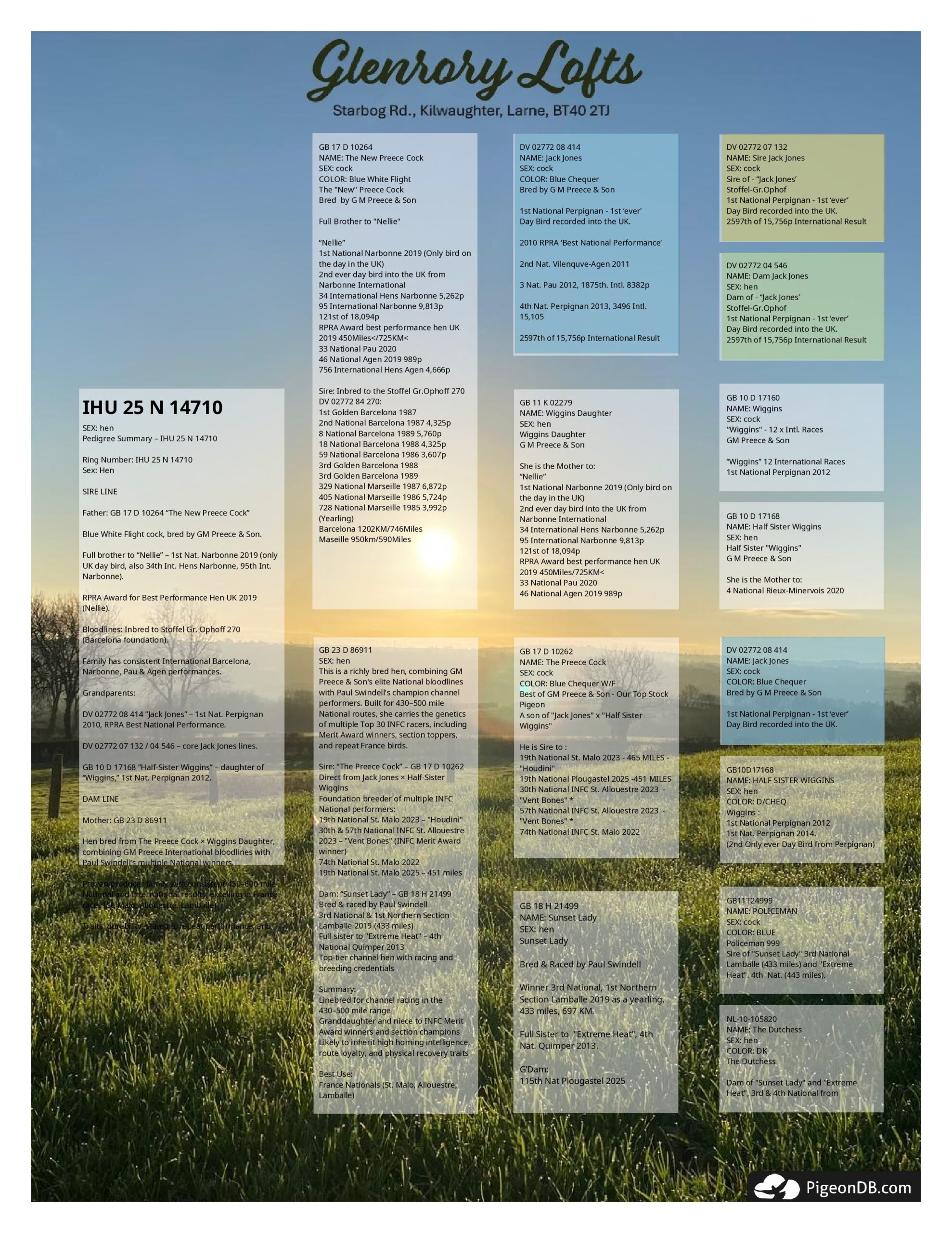 ?The Preece Cock? Bred by GM Preece, Grand Sire of the loft, Sire & G. Sire to top French performing birds with numerous different hens. He features with many of his sons & daughters in the sale. Highlight performances include ?Houdini? 19th Open NIPA St. Malo (Also in the sale), ?Vent Bones? ? Kings Cup Merit Award Winner, ?04? ? the only bird in the Carrick Centre in the 2025 NIPA St. Malo race.