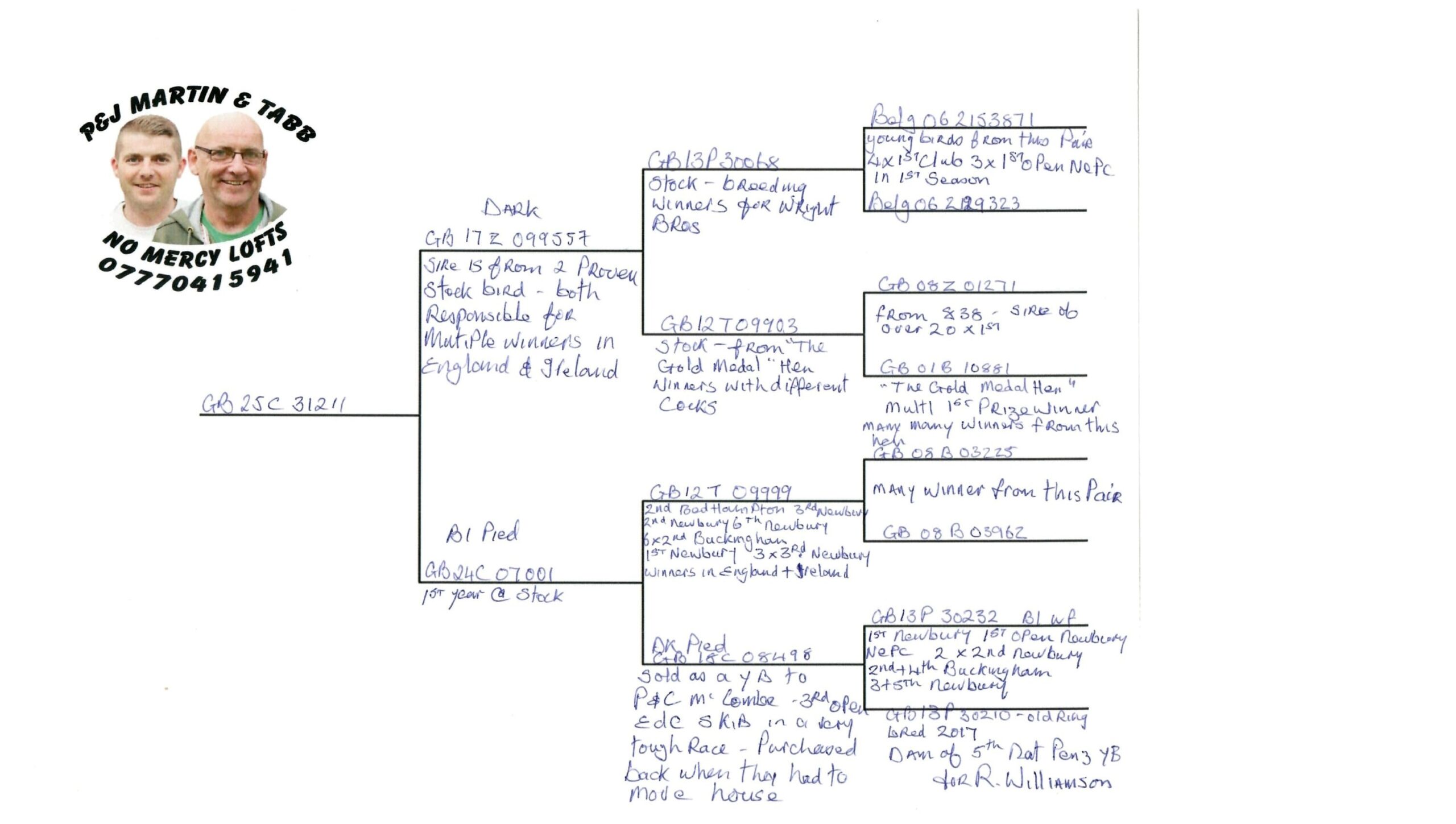 Sire: GB17 Z 099557 (Dark) – from two proven stock birds “both responsible for multiple winners in England & Ireland.”
