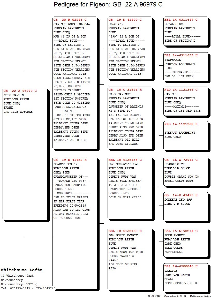 The Sprint/Middle distance birds were attained from top performing lofts for the 2025 season, but circumstances went against the partnership and they were never flown, Birds from Geoff Dickey (Sticker Doncker / Lambrecht), Beggs & Hall – 1st Open Penzance Cock, Peter Martin (Top Van Leemputtens from his best), Herbie Thorpe (Dirk Van Den Bulck / Lambrecht based) and other Van Den Brande and National performing families of pigeons feature throughout the Sprint / Middle distance sale.