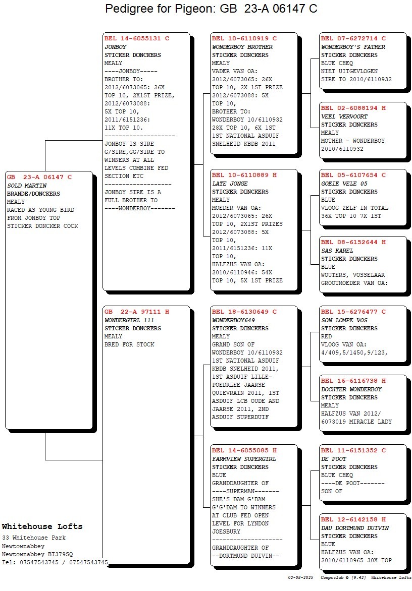 Www.PigeonPartners.Com will manage the internet auction at their website. All birds are currently undergoing a healthy moult and are in good health. The partnership have retained the services of a courier to assist with deliveries throughout Ireland (POA) and the UK (£120 for up to 9 birds). All birds will be supplied with a pedigree and transfer form.