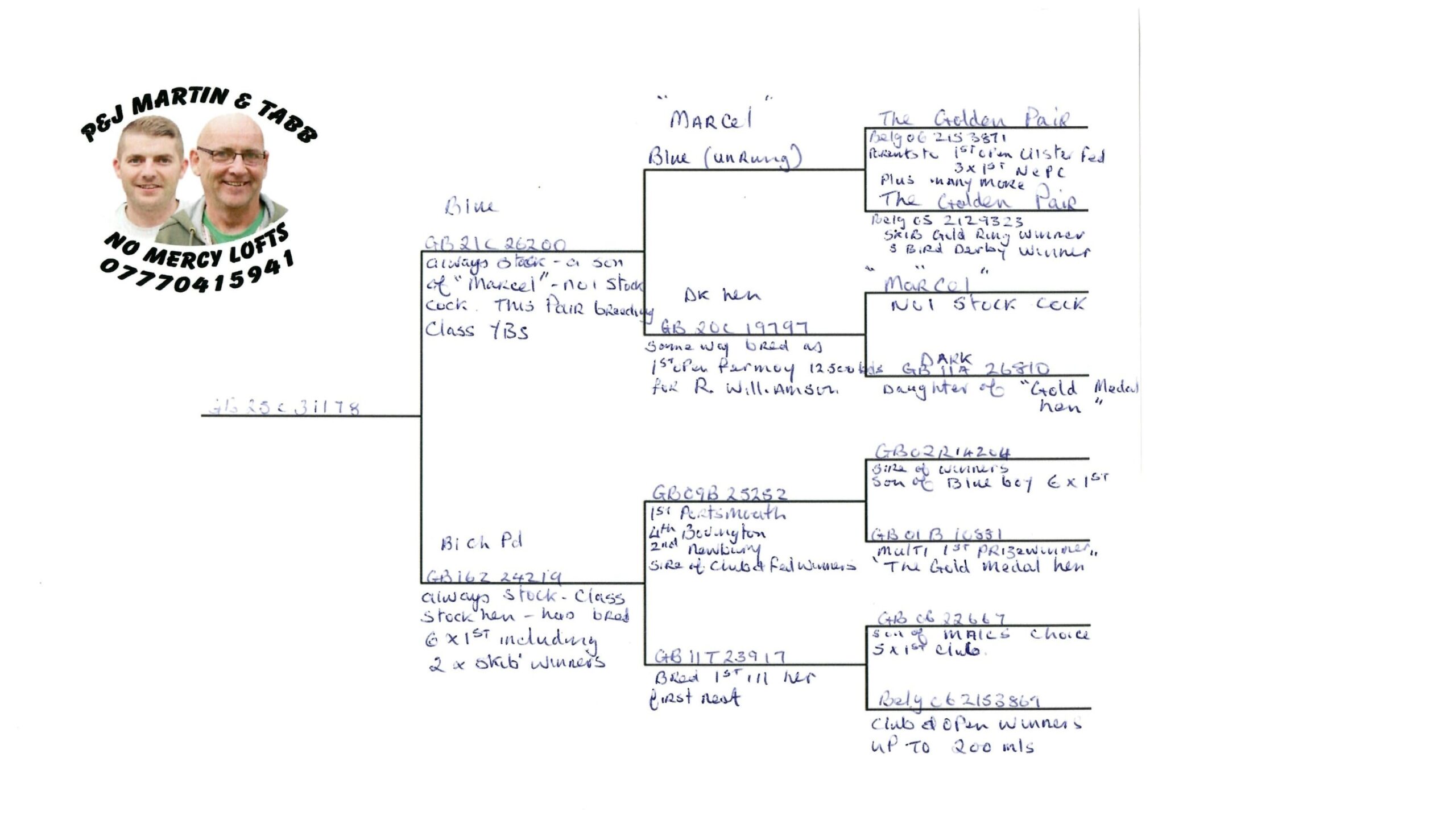 For GB11 T 23917: GB06 22667 (son of “Mark’s Choice,” 51st club) Belg 06-2153869 (club & open winners up to 200 miles).