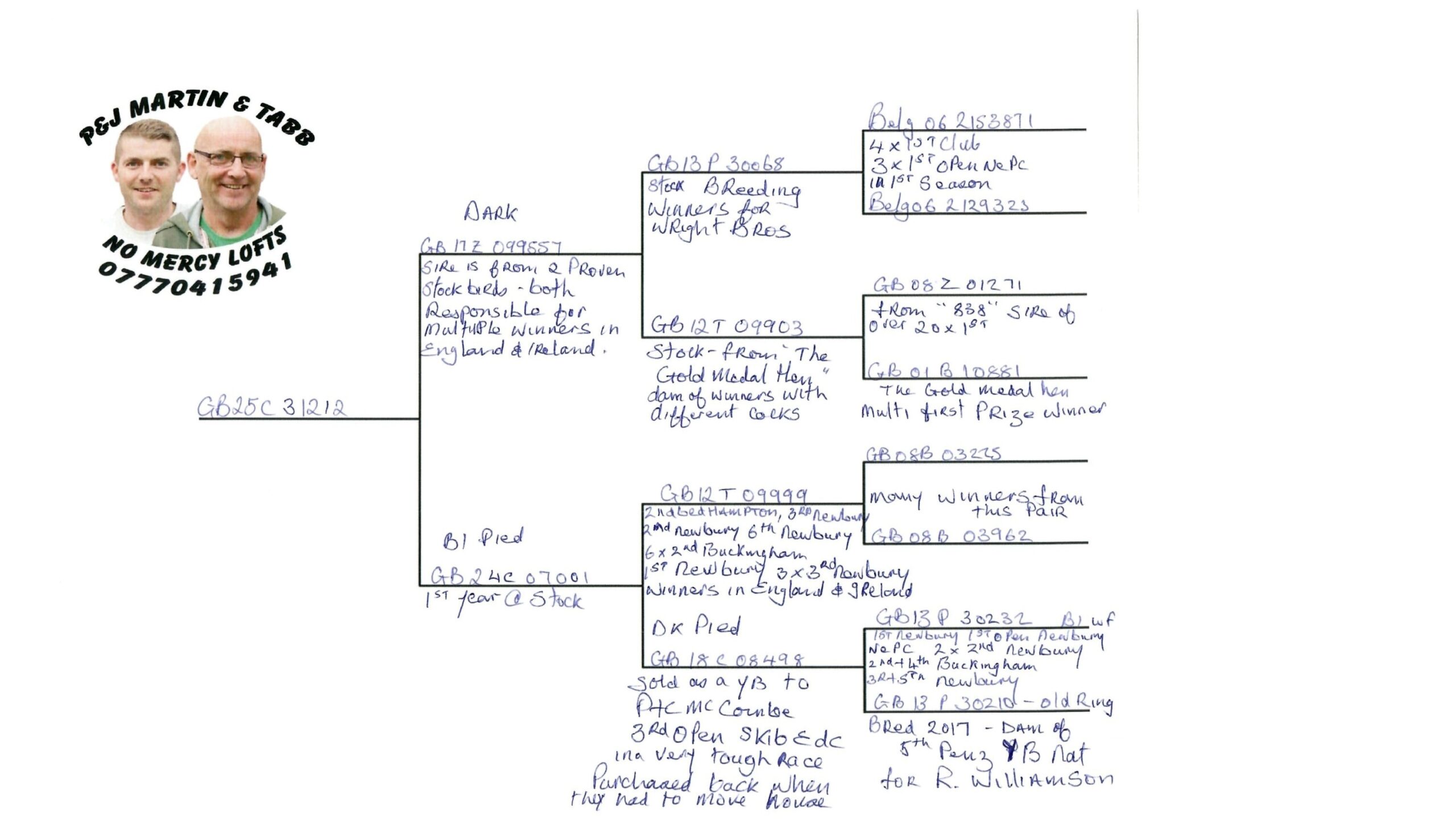 Sire: GB17 Z 099557 (Dark) – from two proven stock birds “both responsible for multiple winners in England & Ireland.”