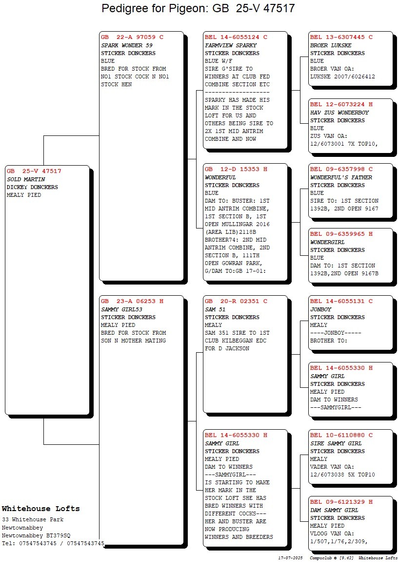 Paternal grandsire: BEL 14-6055124 C Farmview Sparky (Sticker Donckers, blue w/f). Sire and grandsire to winners at Club, Fed and Combine; offspring credited with multiple 1st Mid Antrim Combine results.