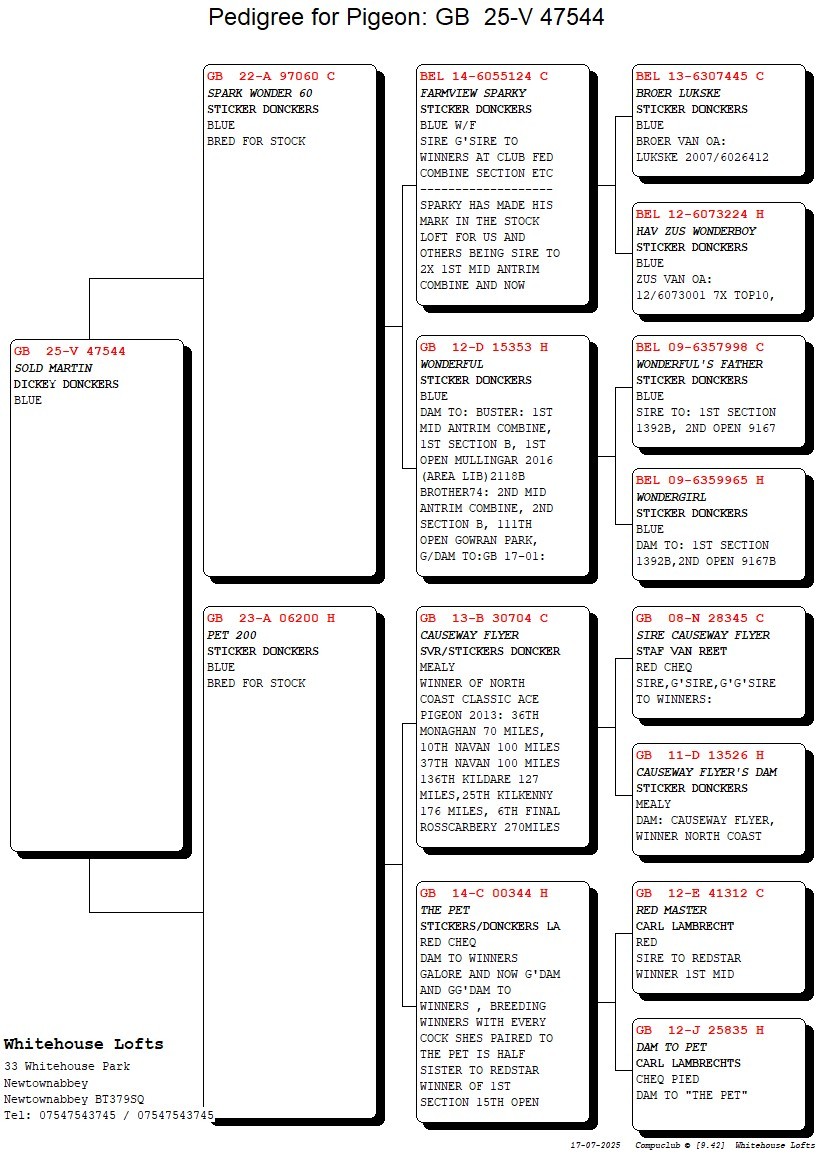 Paternal grandsire: BEL 14-6055124 C Farmview Sparky (Sticker Donckers). Sire and grandsire to winners at Club, Fed, Combine; impact recorded in stock loft.