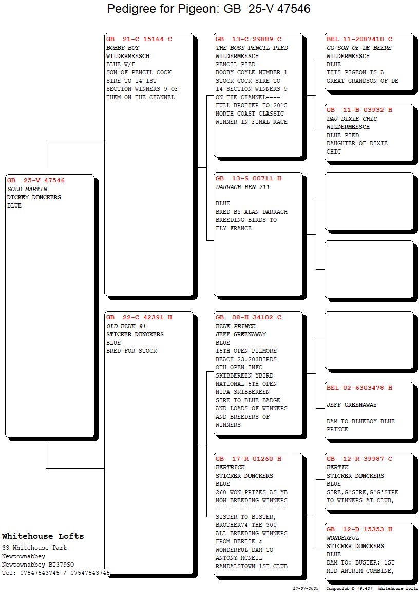 Maternal granddam: GB 17-R 01260 H Bertrice (Sticker Donckers, blue). Sister to Buster and The 300; dam of winners including for Antony McNeill, Randalstown 1st Club.
