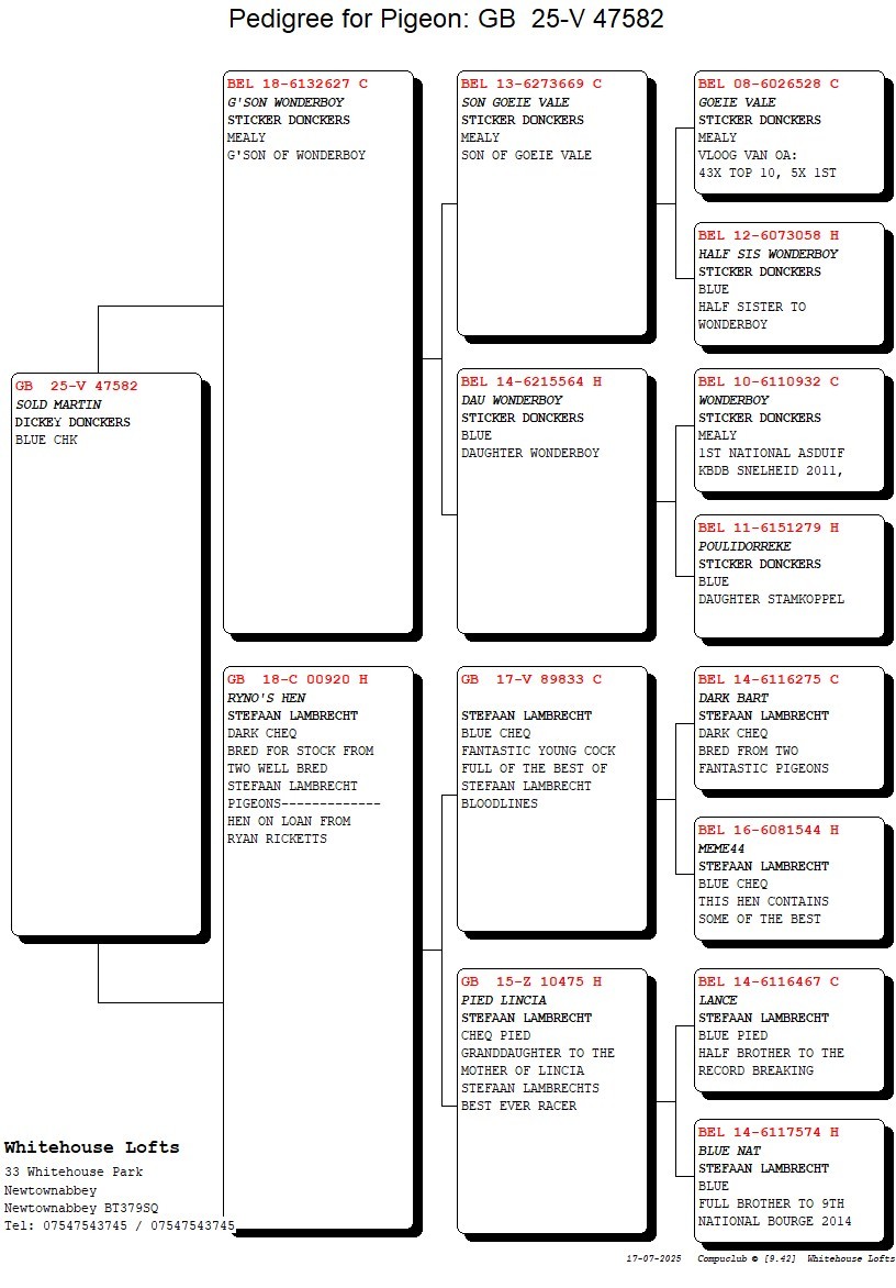 Maternal grandsire: 17-V 89833 C (Stefaan Lambrecht, blue cheq). Young cock of top Lambrecht blood.