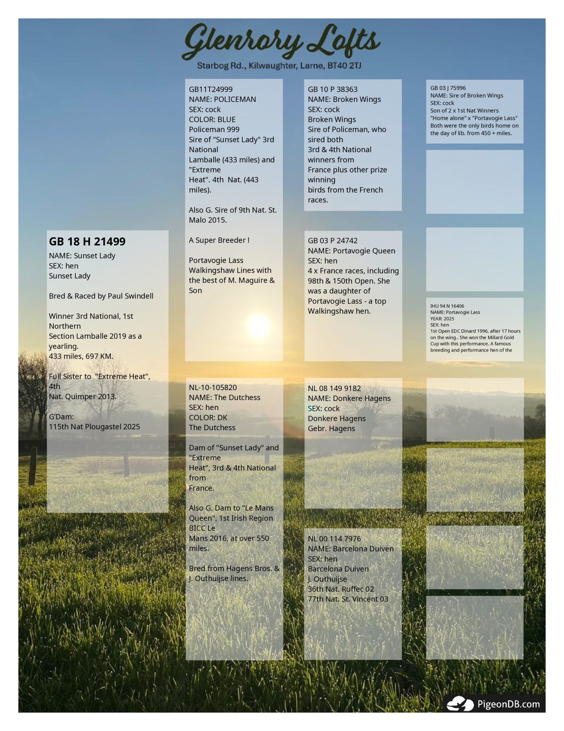 The Sprint/Middle distance birds were attained from top performing lofts for the 2025 season, but circumstances went against the partnership and they were never flown, Birds from Geoff Dickey (Sticker Doncker / Lambrecht), Beggs & Hall ? 1st Open Penzance Cock, Peter Martin (Top Van Leemputtens from his best), Herbie Thorpe (Dirk Van Den Bulck / Lambrecht based) and other Van Den Brande and National performing families of pigeons feature throughout the Sprint / Middle distance sale.